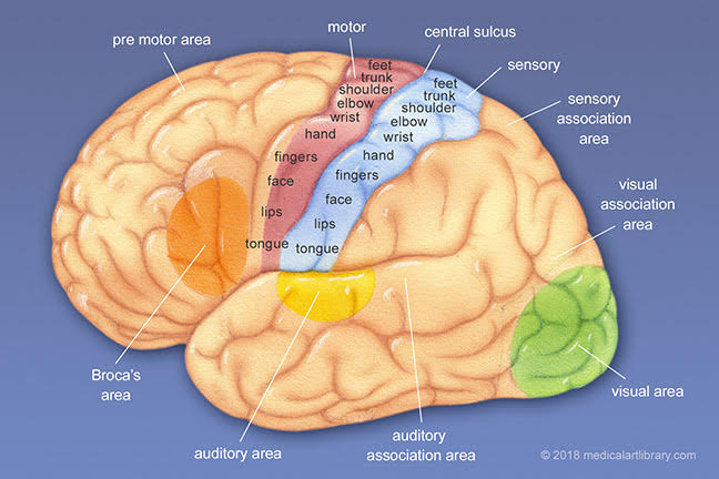 The central sulcus separates the primary sensory cortex from the primary motor cortex. Both regions are organized like a map of the body: different parts of the cortex correspond to different body areas. Notice how the lips, face, and fingers occupy a larger portion—these areas require finer control and have more sensory receptors..