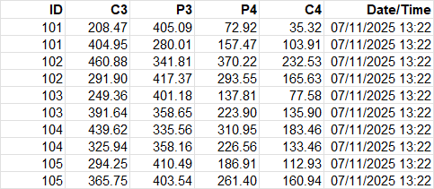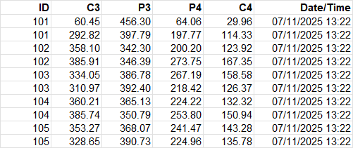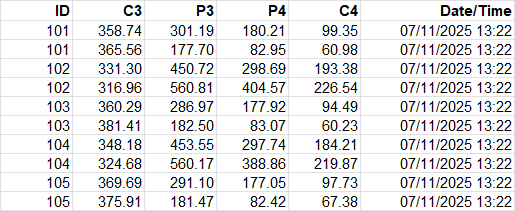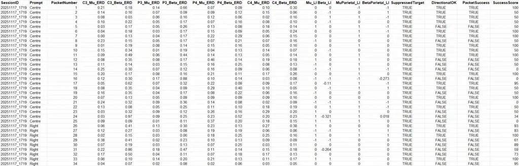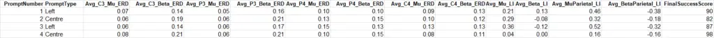 This table gives an overall view of the session, showing how your brain responded to each prompt. Each row represents one prompt (e.g. “Left”, “Centre”), and the columns show average values across all packets processed during that prompt.