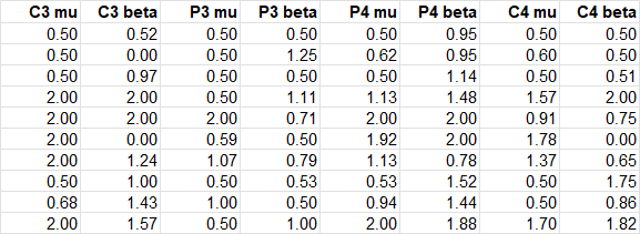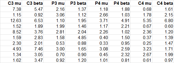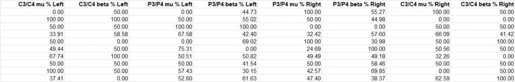 This is the stage where I start to interfere and to turn the raw band power values into a left-right hemisphere balance.  The first step is to use the calibration data where, before the session, I recorded values for the background activity of the brain at each electrode at each frequency.  This can vary of course so I recalibrate before each session, recording band power values for each electrode/frequency band while thinking about nothing in particular, particularly movement. I will post the method I use for this, and how I avoid negative band powers as a result.  I’m very much open to suggestions on how I can improve this process. It results in an adjusted band power which I also output to a log.  Again, only the most recent packet data are held. The example below is from a different session to the raw band power above so please don’t try to derive one from the other.