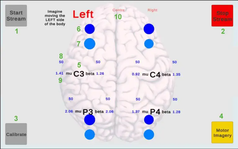 At the top of the screen, when the session is Motor Imagery, a prompt is shown to ask the user to concentrate on imagining movement of one side of the body or to imagine stillness if the prompt is Centre. These prompts occur in a random sequence and last for a random number of seconds. During Motor Imagery, higher brain activity occurs in the hemisphere on the opposite side of the brain to the prompt. Counterintuitively, this activity results in a reduction of the band power in the mu frequency band so the hoped for outcome in for the paler blue circle representing mu power to shrink on that side. The circle on the side of the imagined movement should therefore swell in response since the pair represent the ratio between the two electrodes at that frequency. Beta frequencies may have a similar response but less pronounced according to my sources. The prompts are spoken when they change and a tick runs during the prompt.